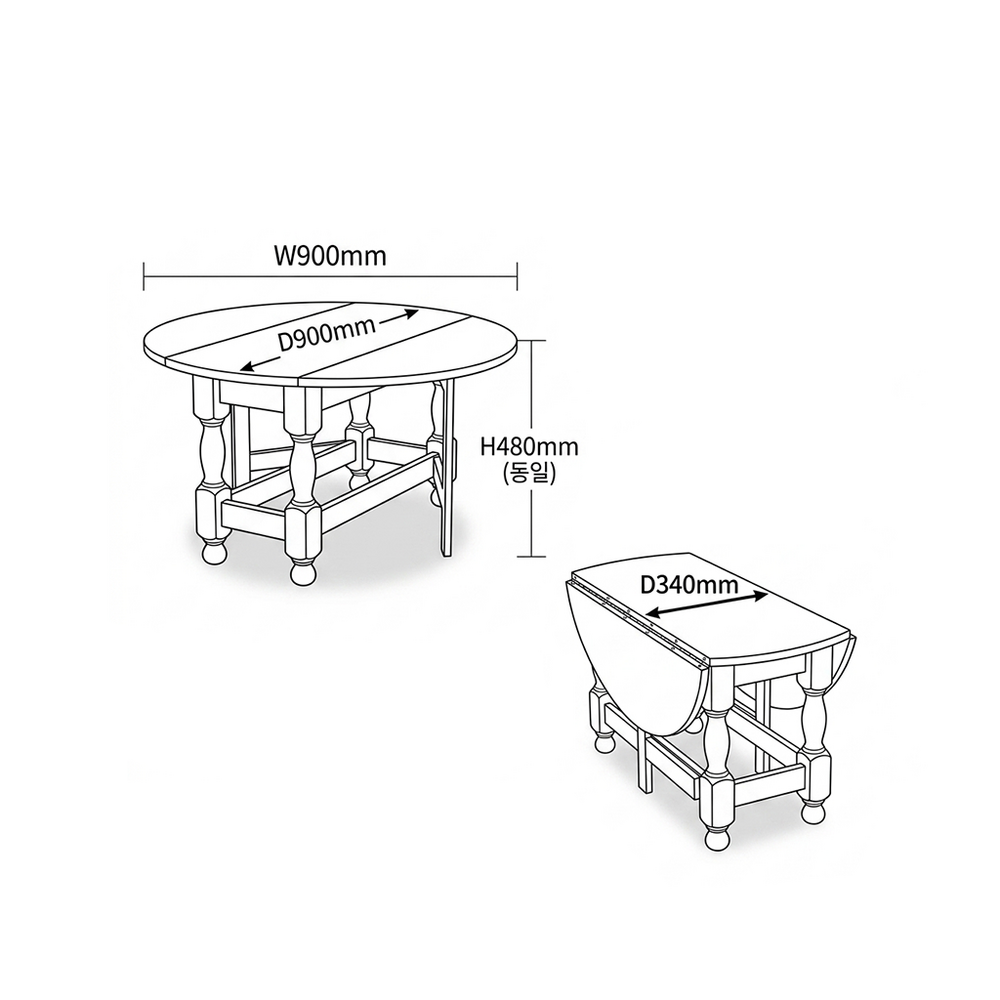 게이트레그(Gateleg) 구조의 다리는 상판을 견고하게 지지하여,